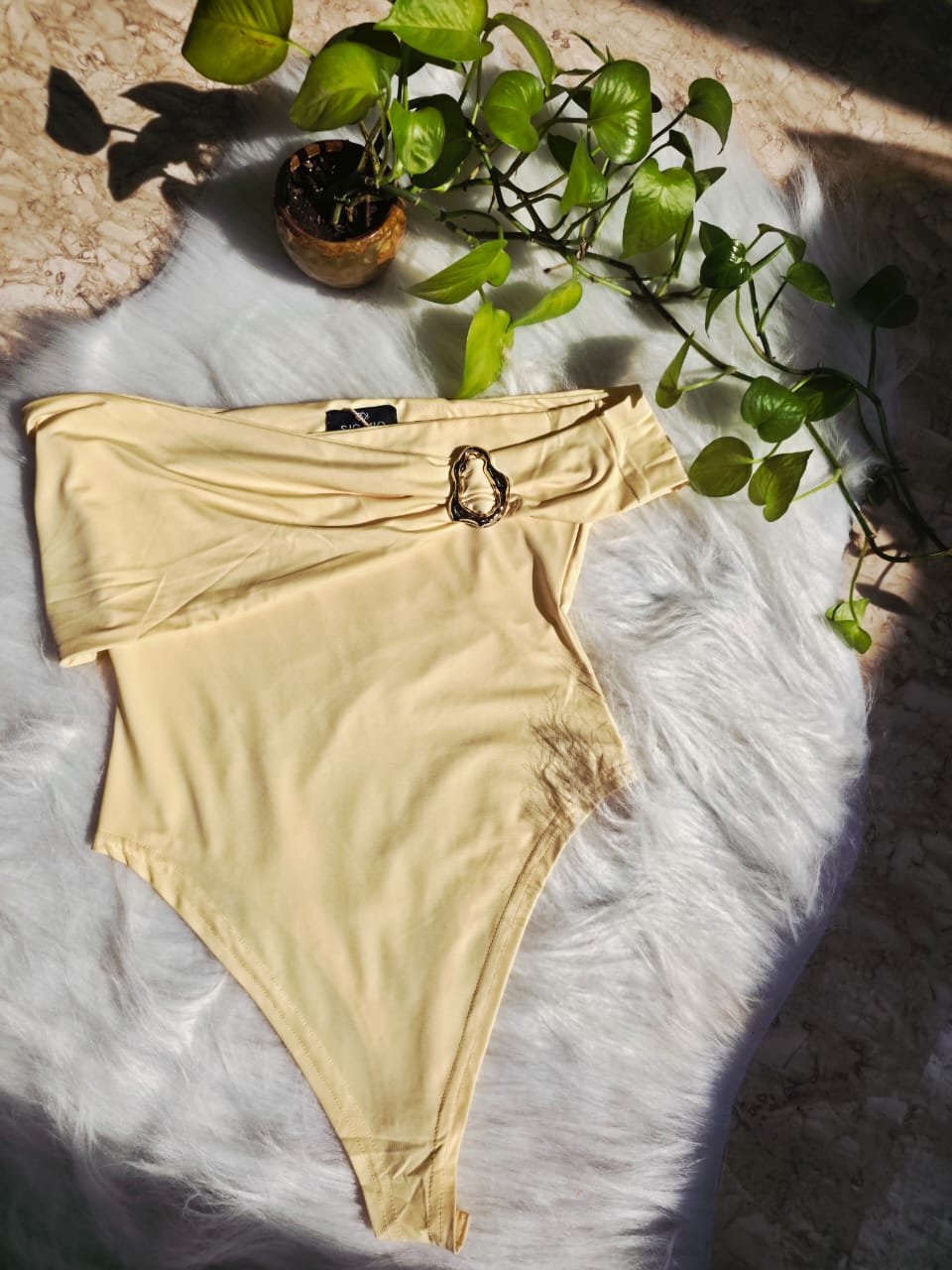 Add a pop of elegance and charm to your wardrobe with this pink one-shoulder bodysuit featuring a unique knot and gold ring accent. Its asymmetric neckline gives a trendy twist to a classic silhouette, making it perfect for both casual outings and evening events.