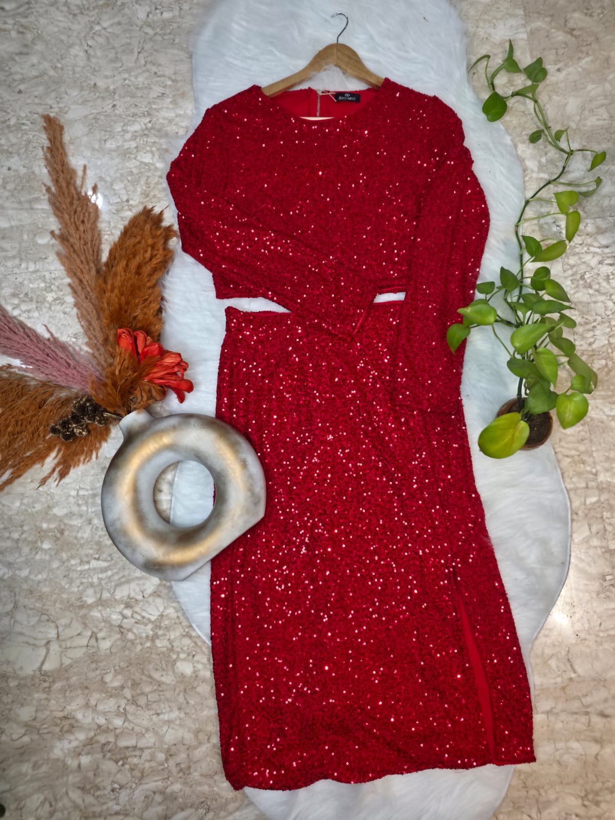 Turn heads in this stunning red sequin co-ord set — the perfect blend of glamour and sophistication. Featuring a full-sleeve crop top and a high-waisted pencil skirt with a chic side slit, this outfit is designed to flatter your curves and make a statement. The shimmering sequin fabric catches the light beautifully, adding a touch of sparkle to every move. Pair it with black boots and a mini handbag for a bold, confident look that’s ideal for parties, date nights, or festive celebrations.