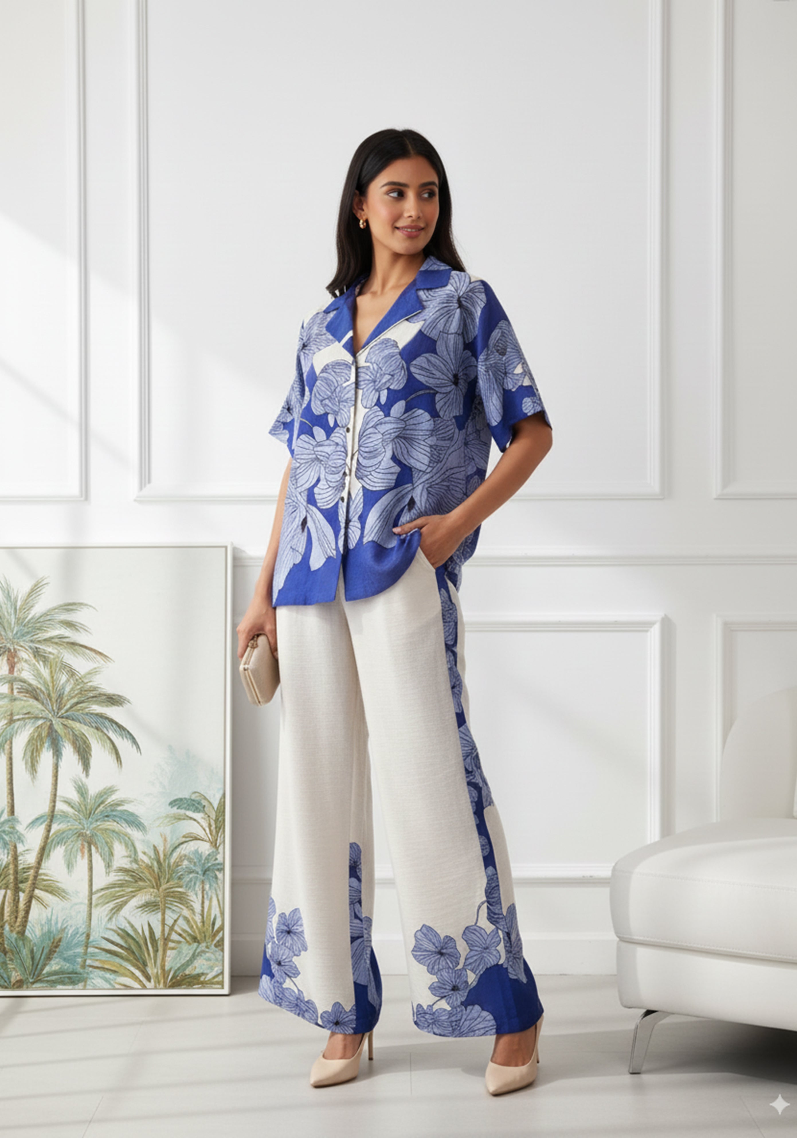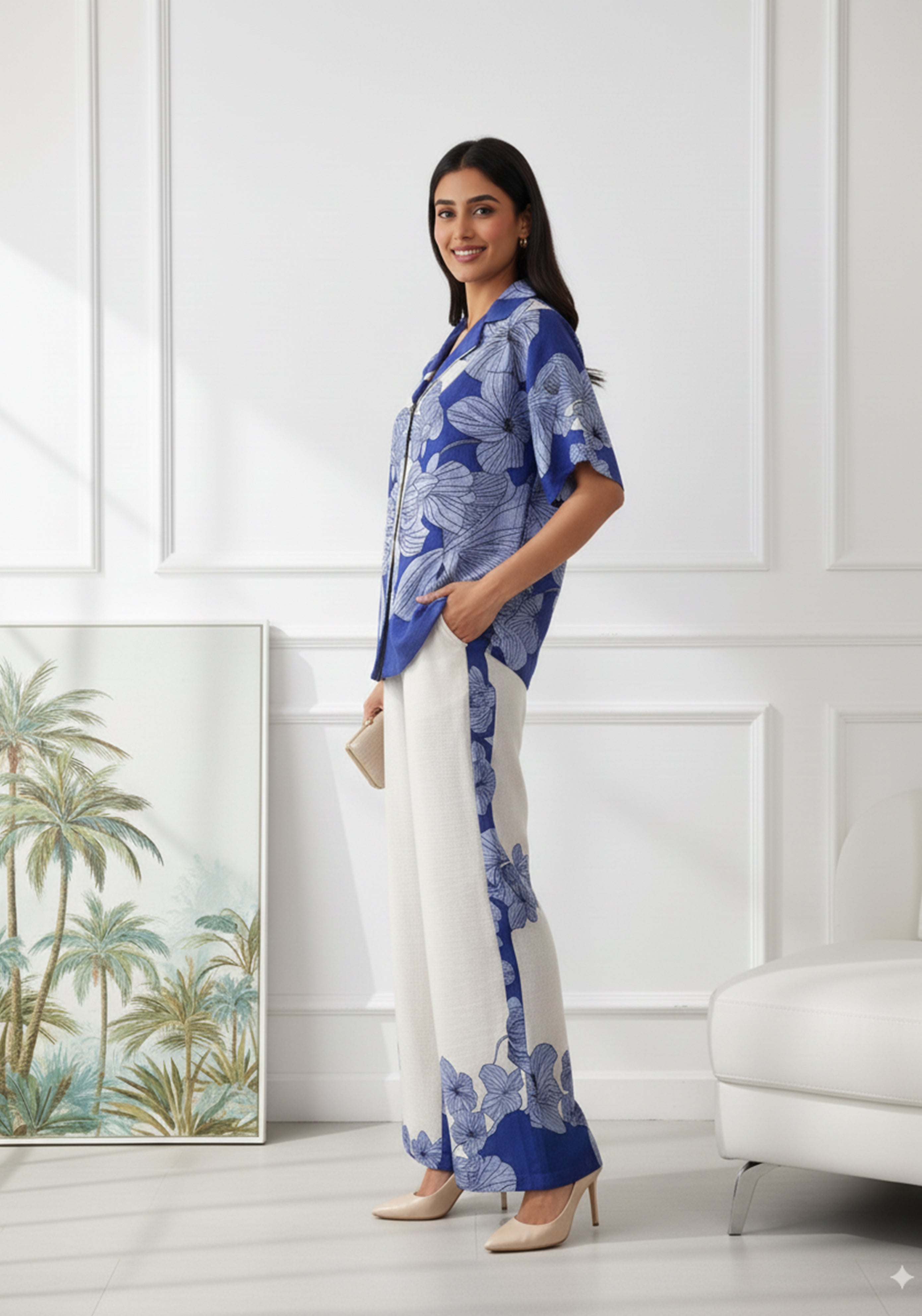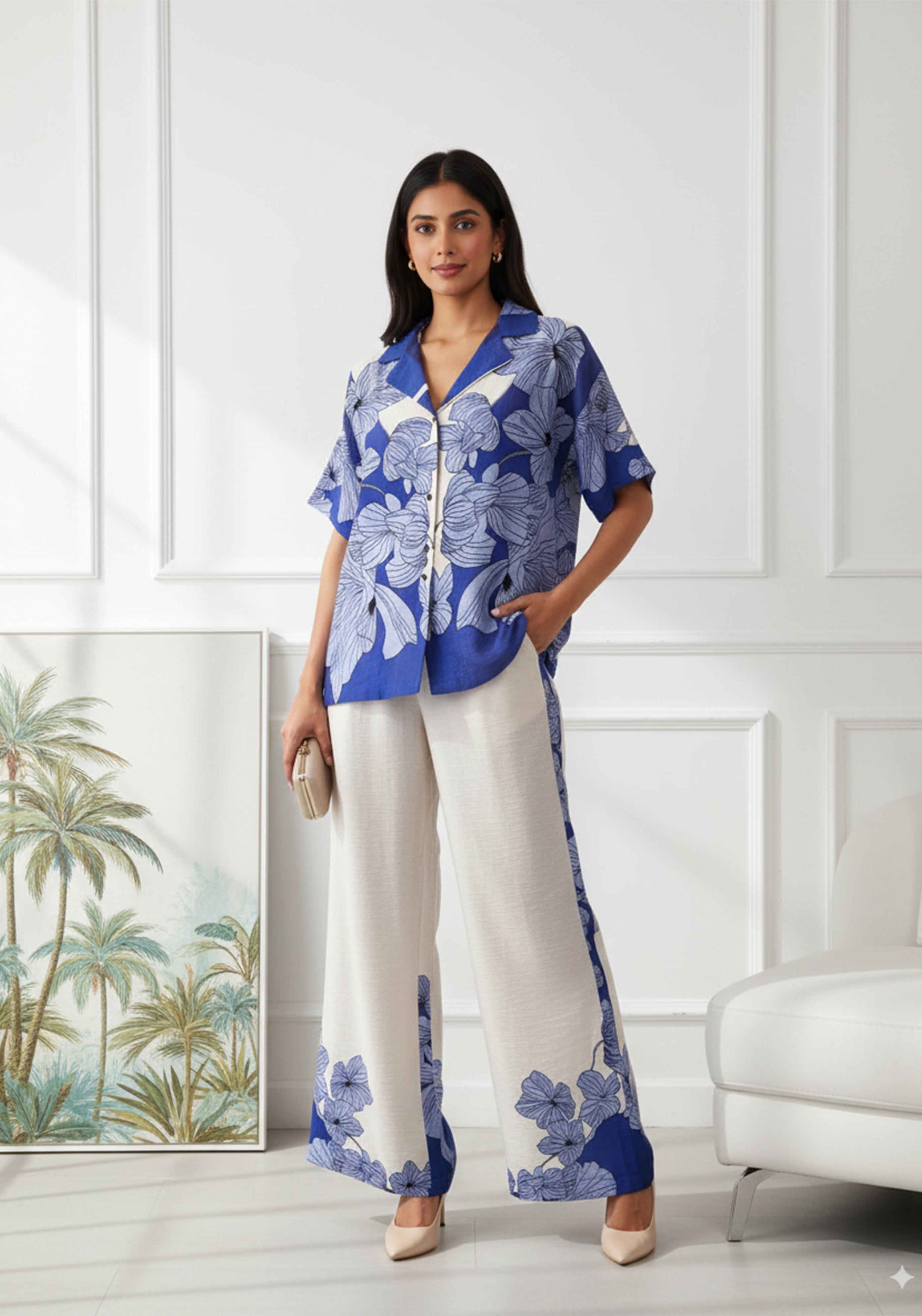 Effortlessly chic and vacation-ready, this blue and white floral co-ord set is the perfect mix of comfort and style. The shirt features a relaxed fit with short sleeves, a collared neckline, and front button closure, paired with wide-leg trousers that boast matching floral detailing along the sides and hem. Crafted from breathable, lightweight fabric, this outfit keeps you cool while looking polished and elegant.