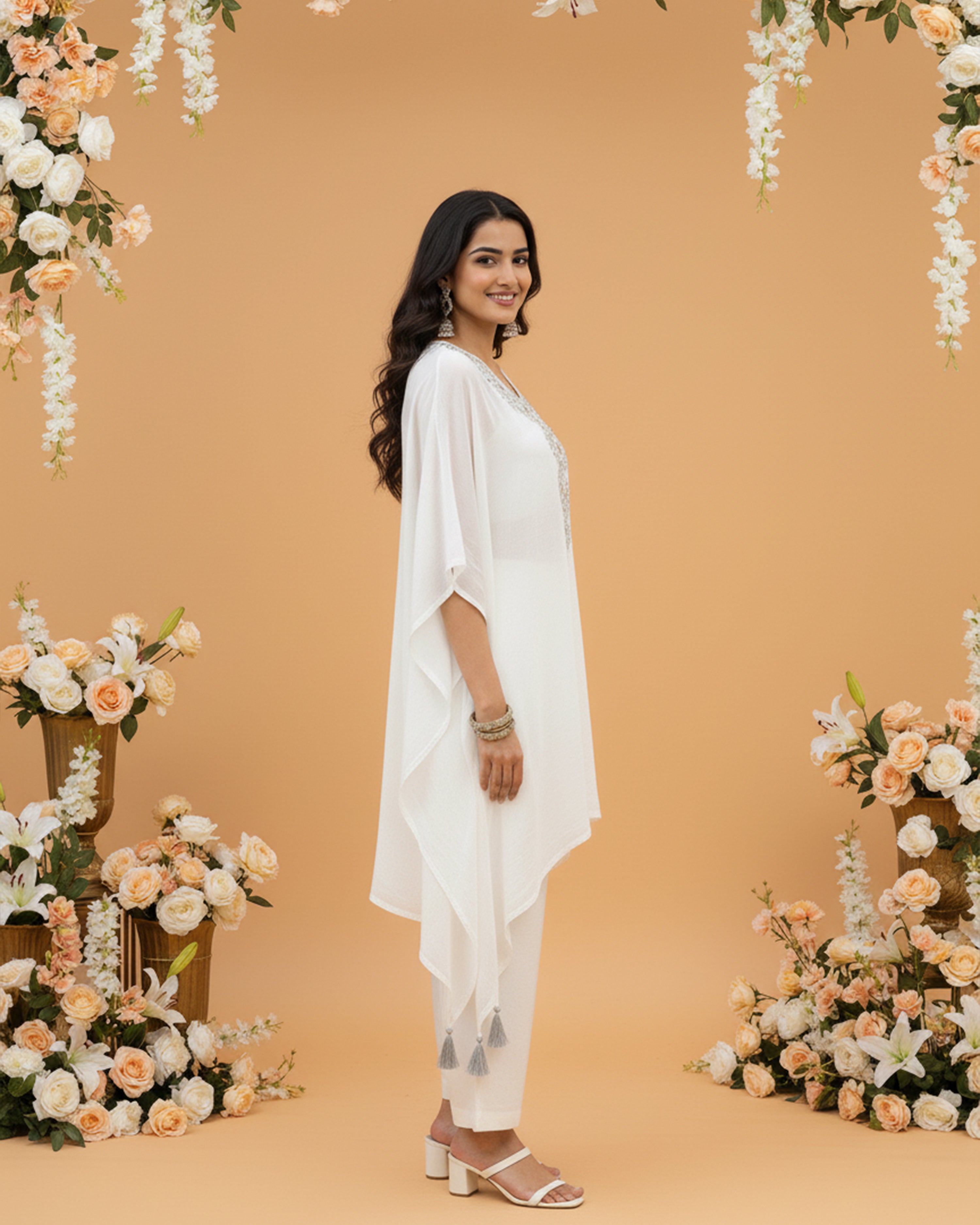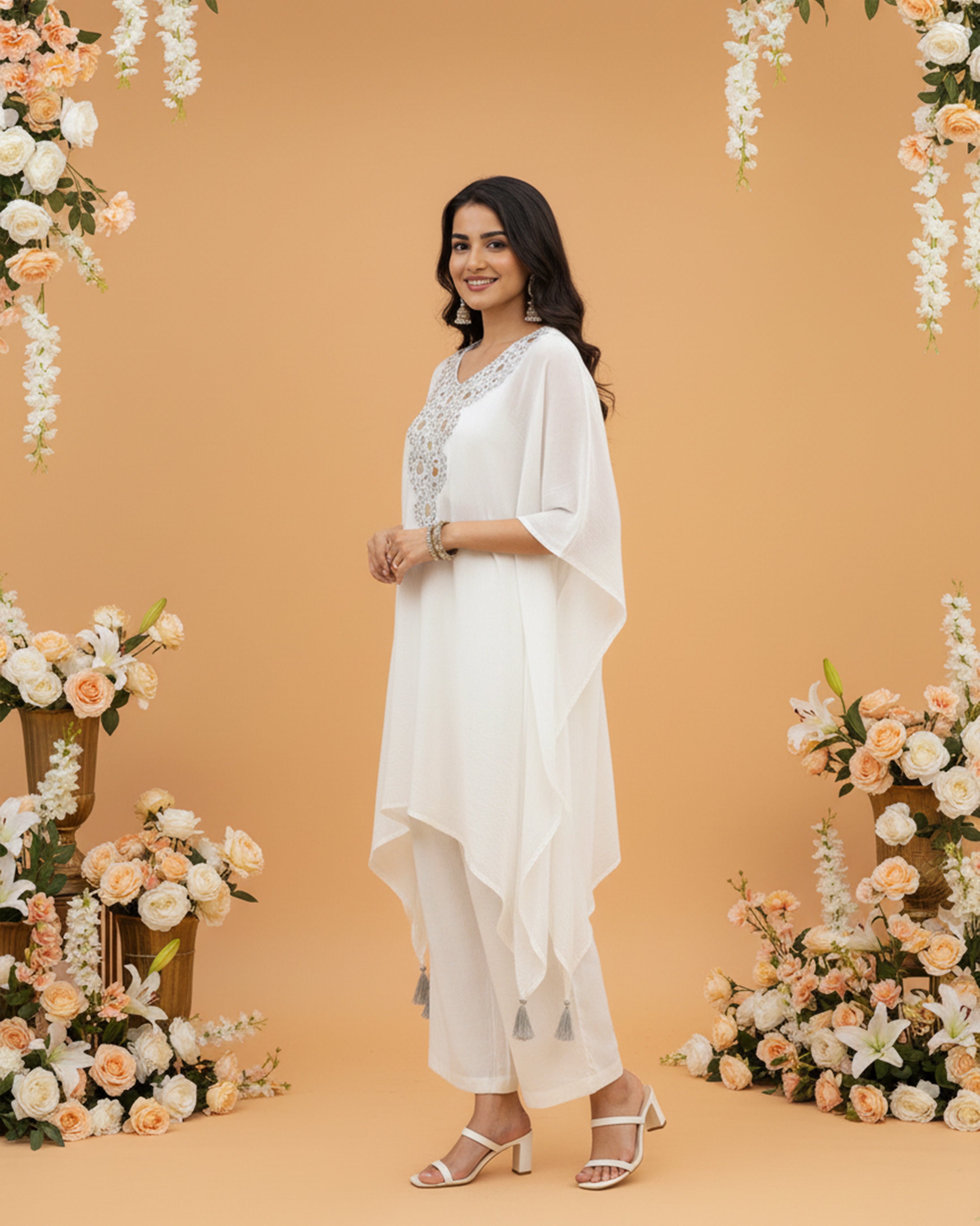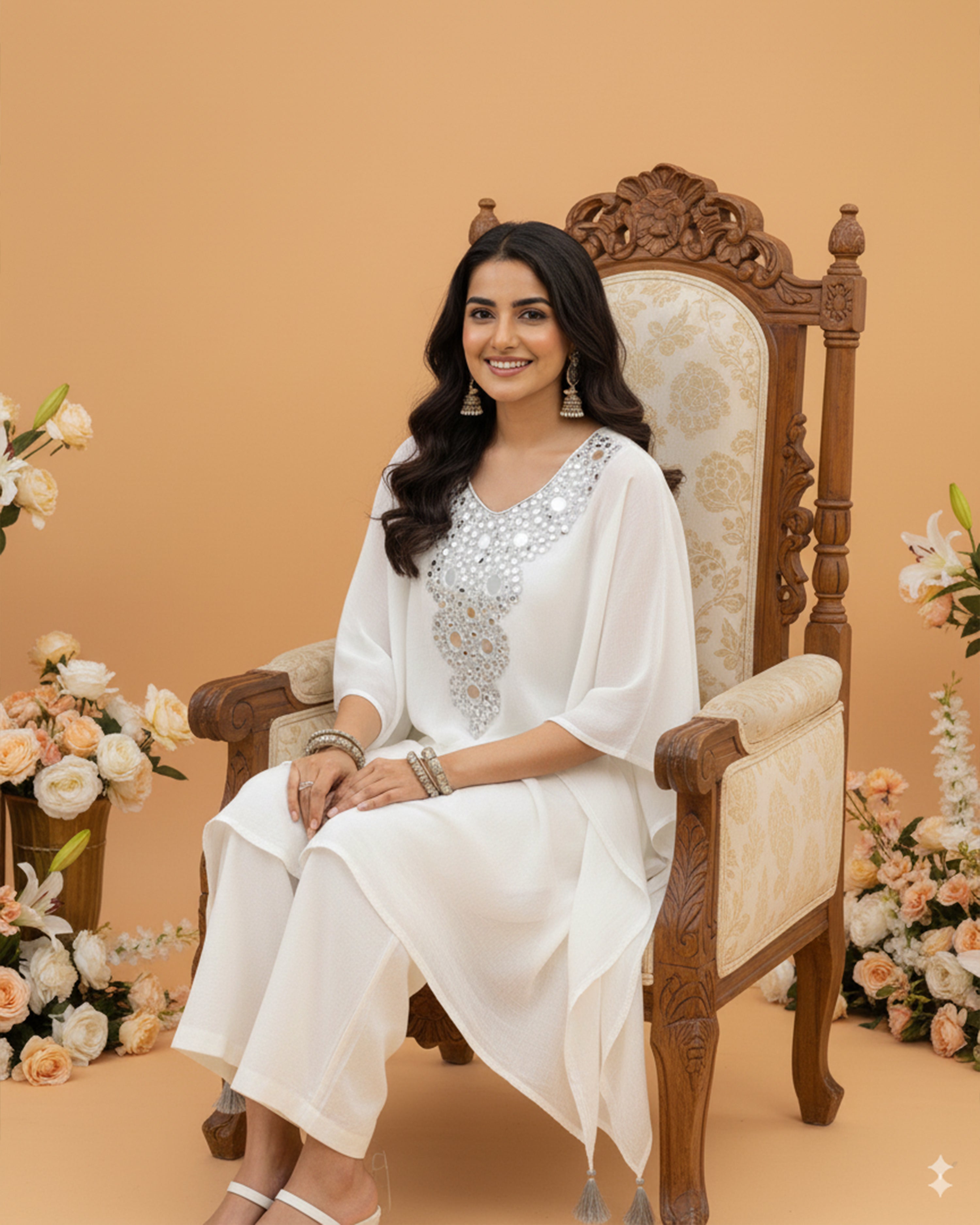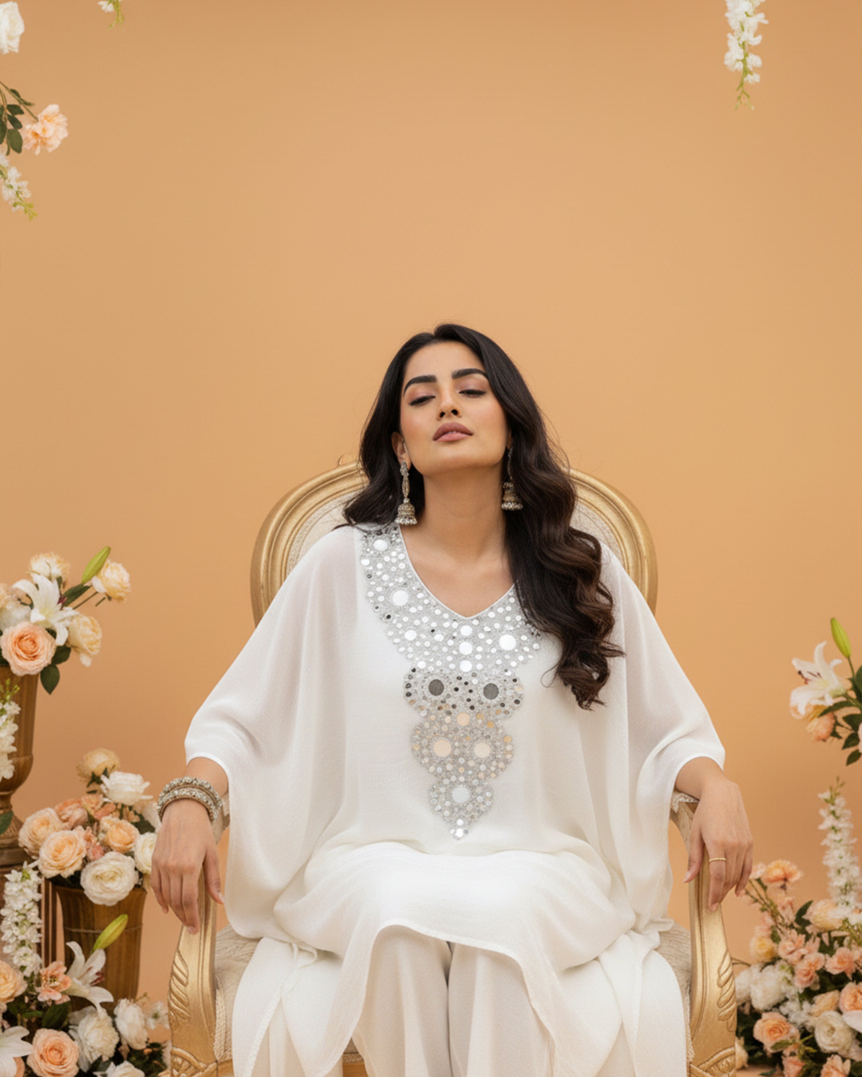 Add a touch of glamour to your wardrobe with our elegant Kaftan 3 Pc Set, beautifully embellished with intricate mirror work. Designed for modern women who love comfort with style, this set includes a flowy kaftan, matching inner, and coordinated bottom for a complete festive-ready look. The mirror detailing adds a radiant sparkle, making it perfect for parties, weddings, or special occasions.