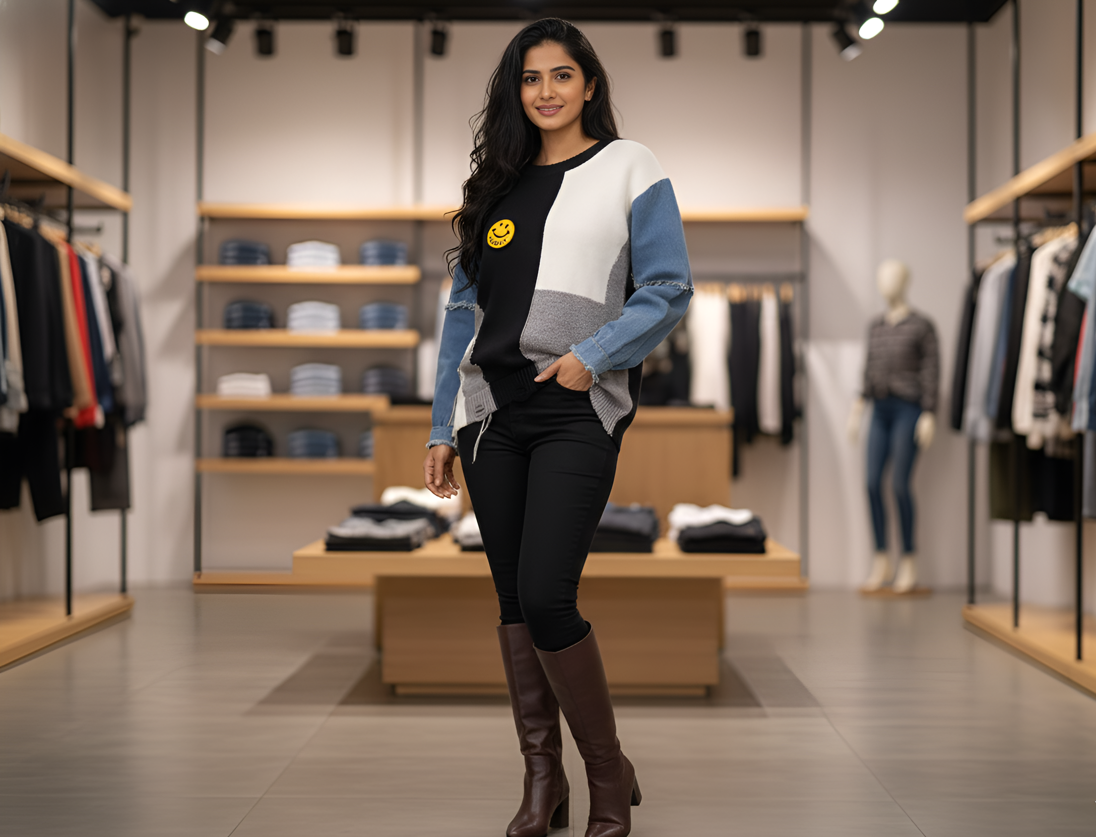 Patchwork Design: Striking colour-block knit panels in contrasting shades for a modern, artistic look.