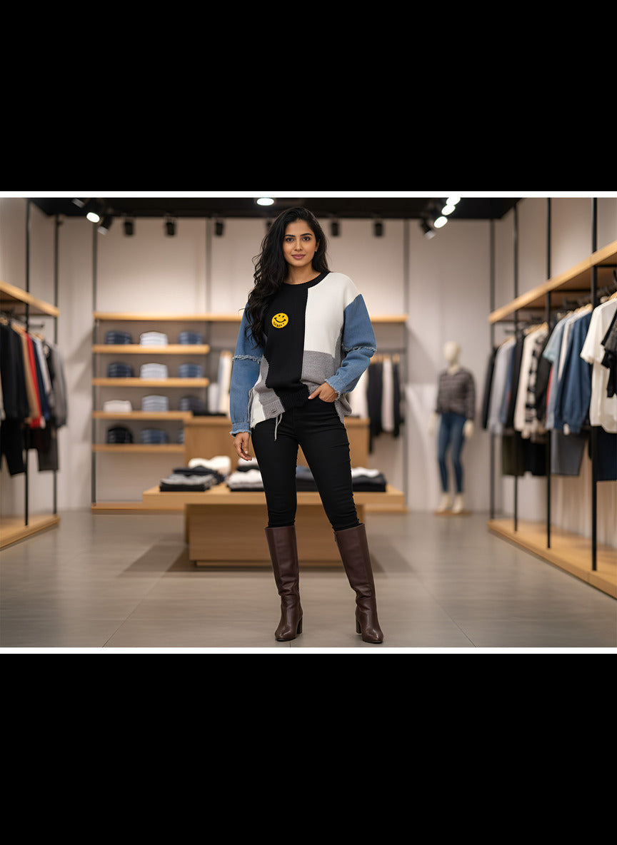Bring bold, street-inspired style to your winter wardrobe with this uniquely crafted Patchwork Knit Sweater/Cardigan/Sweatshirt featuring Denim Sleeves. Designed for fashion-forward individuals, this piece blends cosy knit textures with edgy denim for a standout look.
