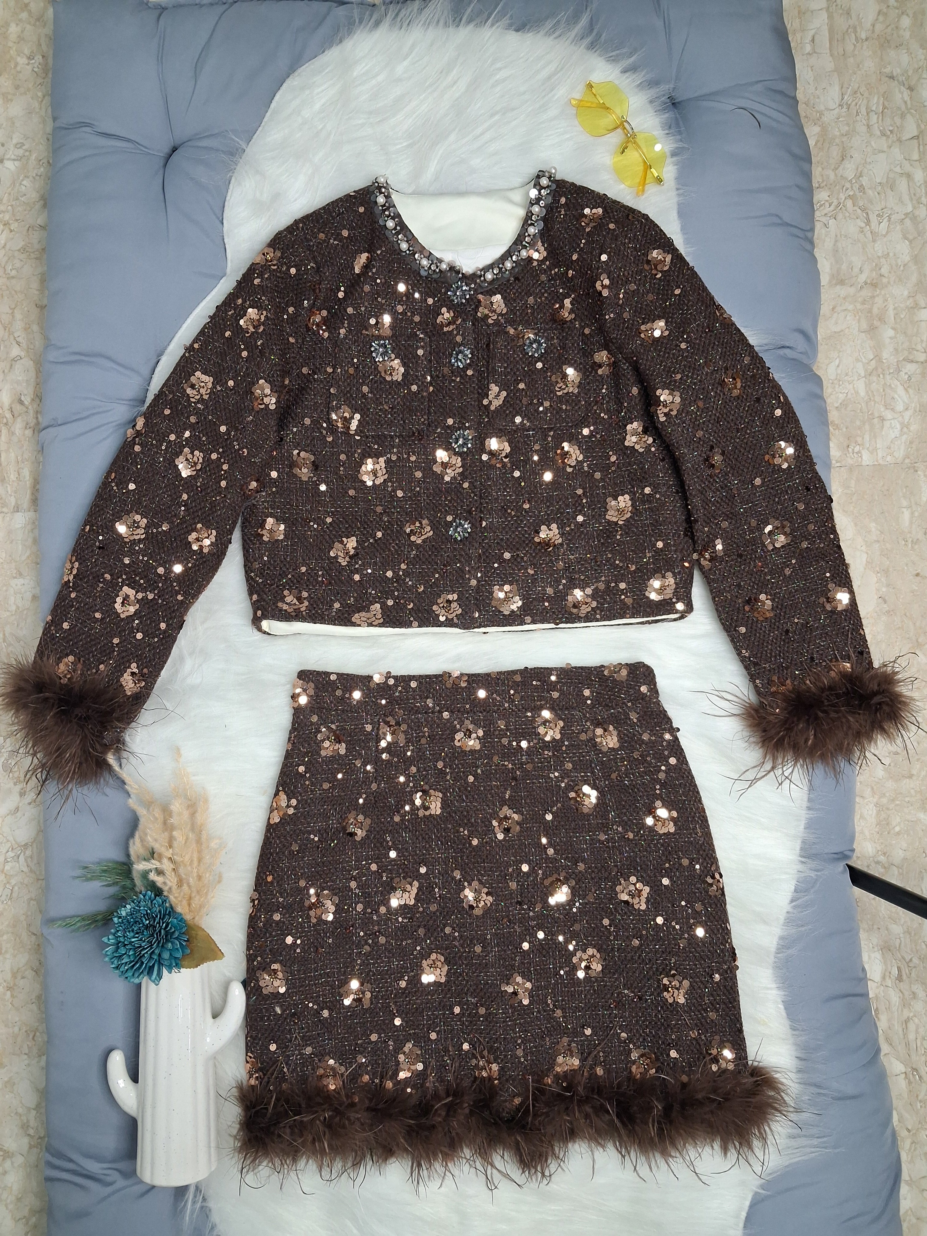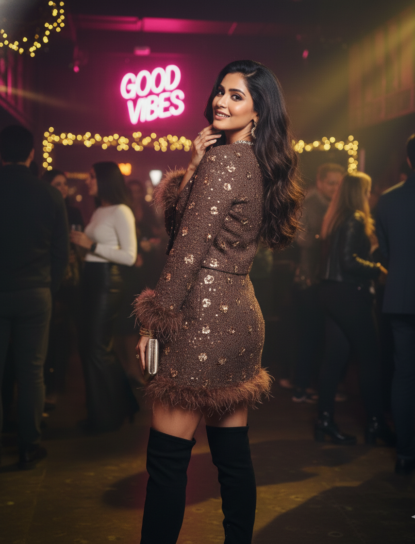 This co-ord set blends warmth, glamour, and luxury in one look. The feather accents, heavy sequin detailing, and premium tweed make it a show-stopping outfit—ideal for women who love bold, statement winter fashion.