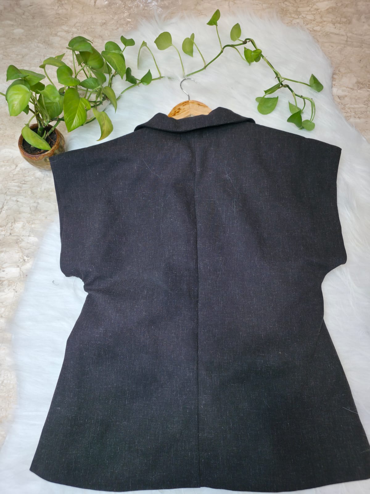 The sleeveless cut and single-button front add a modern, polished touch, while the textured fabric enhances its premium appeal.