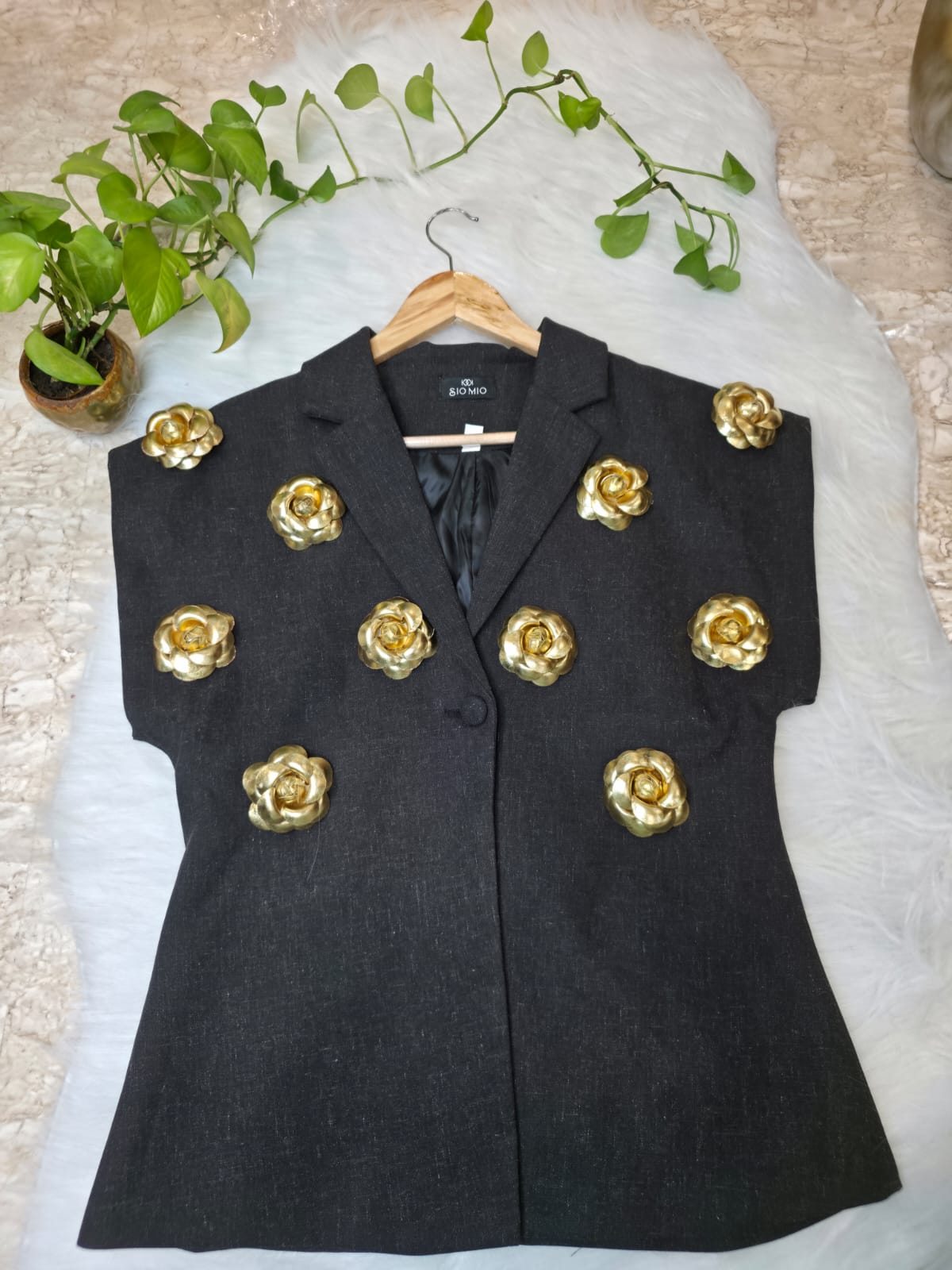 Make a bold fashion statement with this stunning black blazer top featuring luxurious 3D golden floral embellishments. Designed to stand out, this piece blends structured tailoring with high-fashion detailing, making it perfect for parties, events, or any occasion where you want to look effortlessly glamorous.